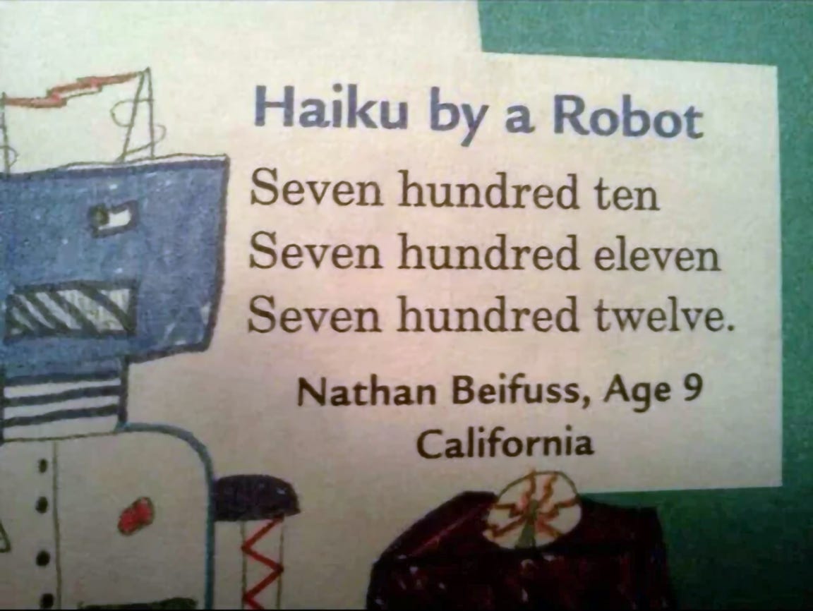 THE FOLLOWING HAIKU was purportedly written by a nine-year-old kid, published in Highlights magazine around a decade ago. It’s a brilliant critique of AI art, if you ask me.