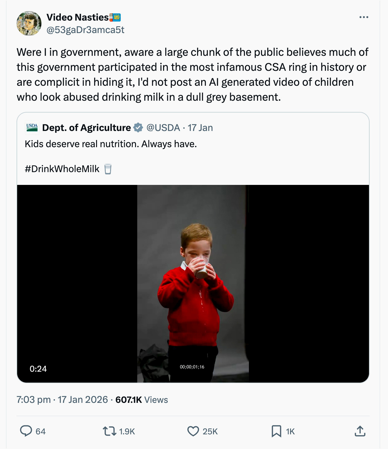HOW ABOUT SOMETHING SO PREPOSTEROUS you’re sure to believe it was made up by a machine? But no, in fact, everyone’s favorite [redacted] created what many suspect was initially intended to be an advertisement promoting the purported benefits of drinking raw milk (until, presumably, the lawyers said, umm, if you want to keep any of your money don’t do that). So now it’s a commercial for whole milk which, fine, do your thing. But proving once again that AI is the shyster’s favorite shortcut machine… the commercial doesn’t feature real children drinking real milk but rather AI renderings of distraught children sadly drinking AI rendered cow beverage.